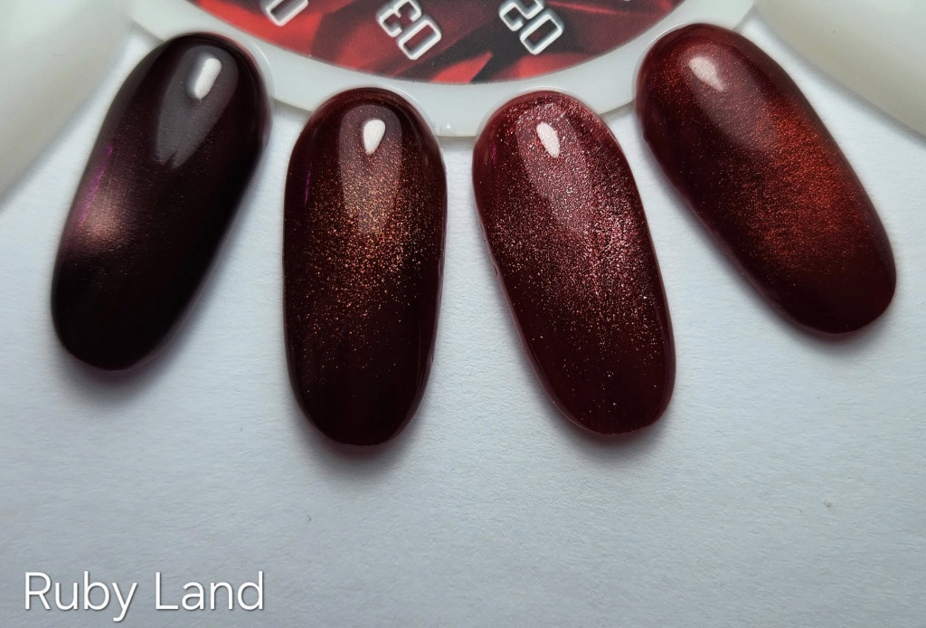 Kolekcia Rubyland bola navrhnutá na lakovanie celého nechtu aj na tvorbu magnetických dekorácií. Špeciálne magnetické pigmenty ožívajú pomocou magnetu a vytvárajú elegantný rubínovo mačací efekt.