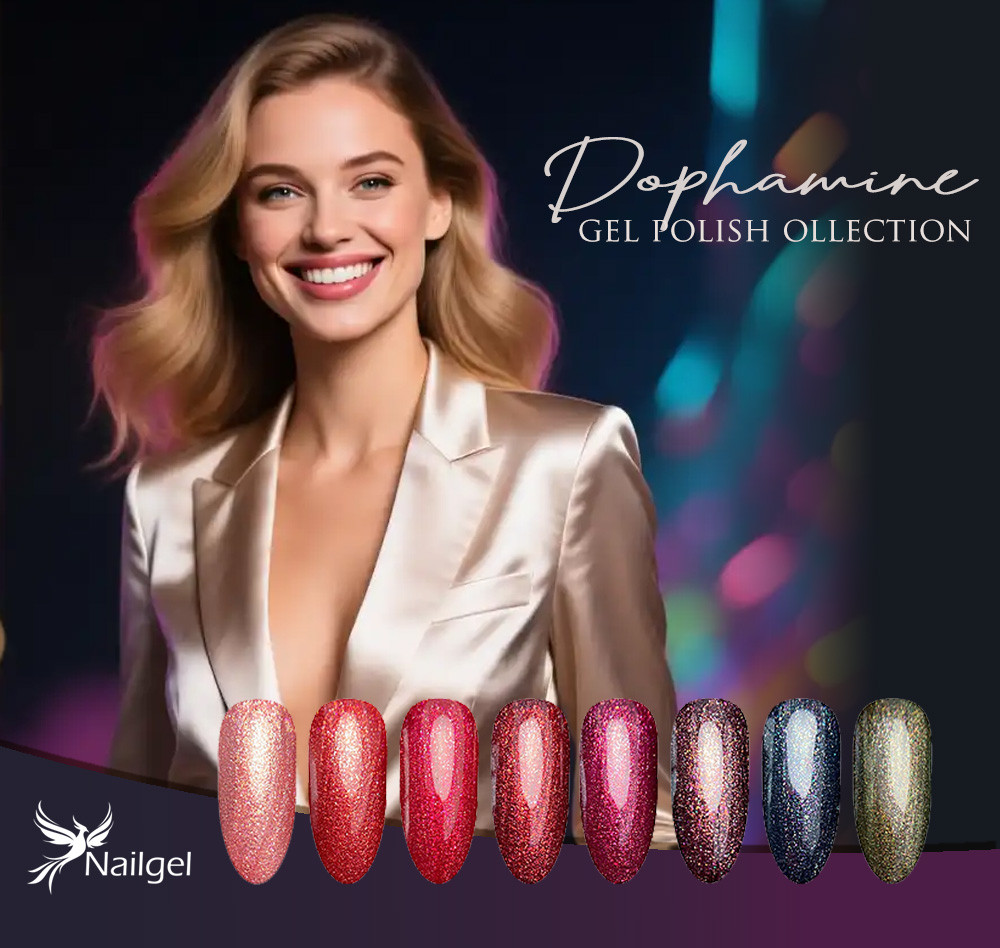 Dopamine Gel Polish Collection – 8 silných, vibrúcich odtieňov, ktoré okamžite zlepšia náladu. Intenzívne farby sa spájajú s jemným, hodvábnym trblietavým efektom, aby pri každom pohybe vyžarovali lesk a sebavedomie. Táto kolekcia je čistá radosť na nechtoch.